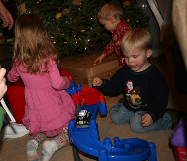 Playing with cousin, Caden's, new race track