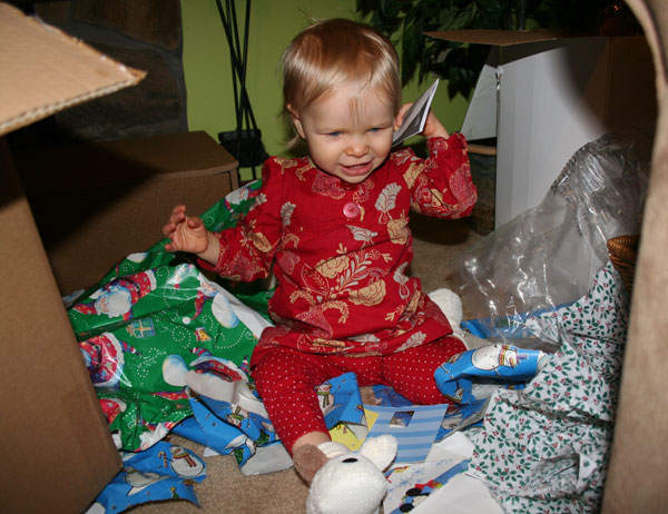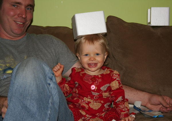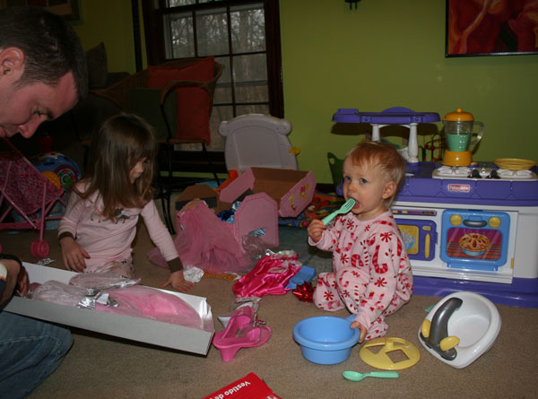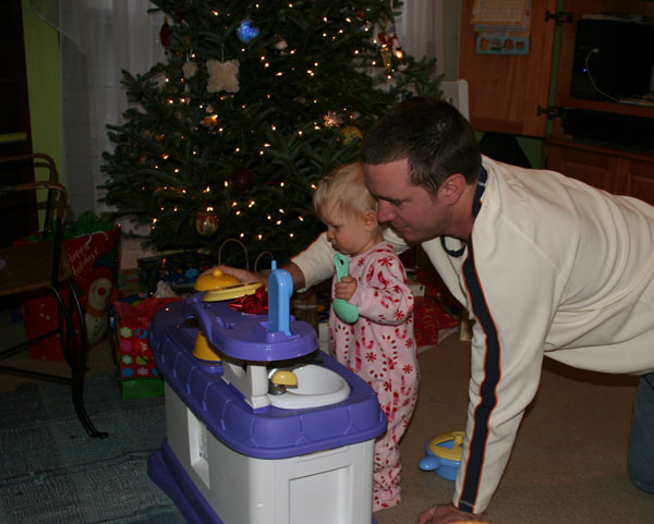 I found myself running a little behind this year on all the Christmas preparations. After Thanksgiving and Lesah's birthday I was ready for a break, yet I had not even begun to think about Christmas. I was especially excited for Christmas morning this year. I'd been reading the Christmas Story (children's version) and other Christmas books to the girls, building anticipation for the day. Camille loves to "read". She sometimes can "read" a book to me from memory after hearing it only a few times (I'm talking about books with only a couple lines per page). Also, when she sees writing in various places she points it out to me- "It says, 'Happy birthday baby Jesus.'" This Christmas everything said "Happy birthday baby Jesus." That's how it should be, right? This was kind of a difficult month for Lesah. I'm not sure if it was a cold or the molars coming in, but she was clingy & crabby a lot. She did alright Christmas morning, but she was feverish & lethargic that afternoon. She was fine after I stripped her down & gave her some Tylenol. I think Lesah enjoyed her Christmas presents, but give the child a spoon & a dish and she can entertain herself pretty well. That's all she really needed. She had her one year doctor's appointment this month. She's at both ends of the spectrum for height & weight. She is such a dainty little thing. At 19 pounds I still feel like I'm holding a baby when I hold her. She is our little cuddle bug. I love it when she wraps her arms around my neck & pats me on the back. It's so sweet. We rang in the new year with my sister, Elaine, & her kids. The rest of my family didn't make it this year due to illness.